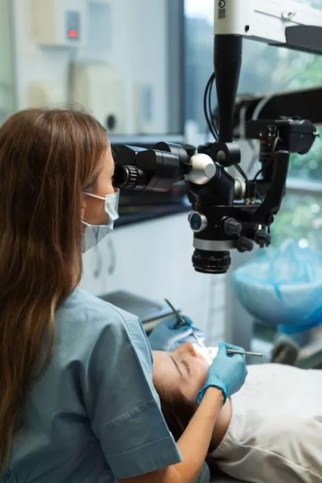 Под увеличением врач получает возможность детально рассмотреть структуру зуба, аккуратно удалить пораженные ткани, качественно обработать каналы и герметично запломбировать их, минимизируя риск осложнений. Эндодонтическое лечение под микроскопом повышает шансы на сохранение сильно повреждённого зуба.
